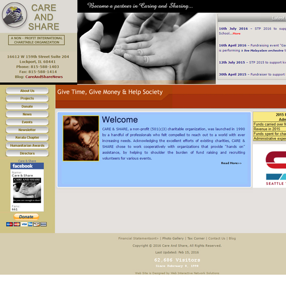 During first decade of its operations Care & Share mainly supported the projects in United States. It reached the homeless and hungry through partnerships with local charitable organizations such as Olive Branch Mission (Chicago’s oldest charitable agency), Living Light Outreach Center in Englewood, Daybreak Family Support Center, Morning Star Mission in Joliet, Apna Ghar (Our Home) in Chicago and weekly feeding program at the People’s Church in Chicago. Care & Share also conducted free eye clinics and free distribution of eye glasses for the most needy people. Starting 2000 Care & Share is more focusing on projects in India especially in Kerala State. A Kerala Chapter was formed in year 2002 and spearheading in various social welfare programs. We support orphanages, pain and palliative care units, cancer and chronic kidney patients, help poor students with scholarships to achieve their higher education dreams and conduct regular medical camps for the early detection of eye problems and other diseases such as Asthma, Chronic Kidney Diseases, etc.