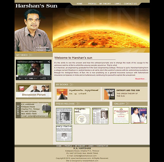 K A Harshan, an engineering graduate from the Govt. Engineering College, Thrissur is up to. Harshan hailing from a village named Chazhoor in central Kerala is all set to storm the world of science with his astonishing revelations through his biological theory of Sun. He is now practicing as a general insurance surveyor with nationalised insurance companies in India and simultaneously continuing his pursuit to explore the unexplored.