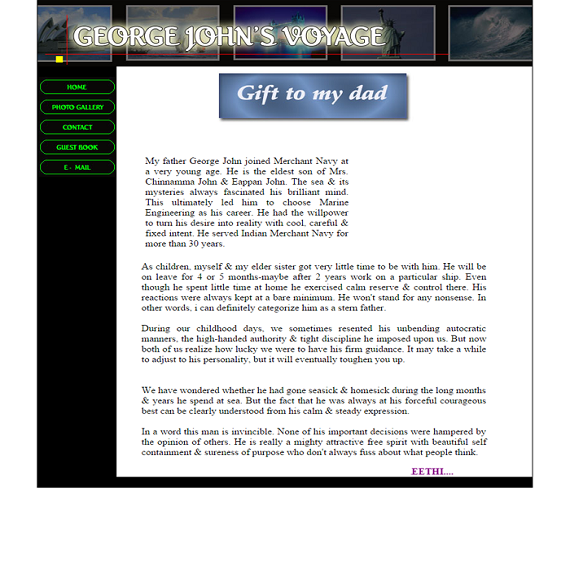My father George John joined Merchant Navy at a very young age. He is the eldest son of Mrs. Chinnamma John & Eappan John. The sea & its mysteries always fascinated his brilliant mind. This ultimately led him to choose Marine Engineering as his career. He had the willpower to turn his desire into reality with cool, careful & fixed intent. He served Indian Merchant Navy for more than 30 years.